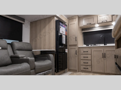 Escape the city life for weekend trips in this cozy couple's trailer. The dual entry doors will allow you to enter in through the rear private bedroom, or the front kitchen/main living area for convenience. You will enjoy relaxing on the theater seating across from the 32" TV and fireplace in the evenings, or you can visit outdoors under the 19' power awning. You'll also find an exterior griddle here for quick meals and exterior storage for the fishing poles or hiking gear. This model also includes a walk-through bath with a shower skylight, a linen closet, plus a Showermiser Water Saving System. And don't worry about storage space inside since this model includes an entryway pantry/closet, a second pantry in the front kitchen, plus a large bedroom wardrobe to keep your clothes wrinkle-free!